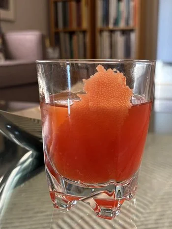 This variation cuts the Campari in half, bumps up the gin by half, and adds a touch of grapefruit juice. Also very refreshing on a hideously hot afternoon, like we’ve been having lately, but a little less smooth, and a little bit sour. Still strong, and of course, totally delicious!